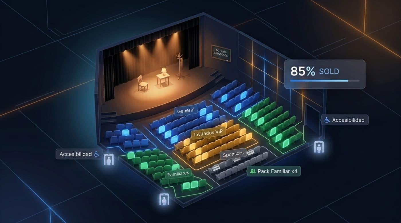 Auditorium, accessibility, and sponsored sections. Sell family tickets and guest packs.
