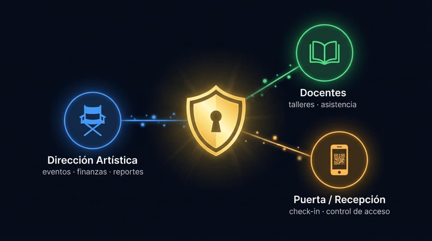 Admin sees payouts, teachers publish workshops, door validates QR. No shared passwords.