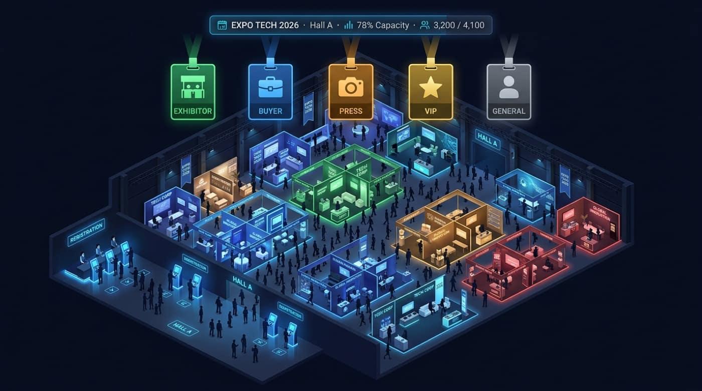 Exhibitor, visitor, delegation, and VIP with independent rules in one checkout.