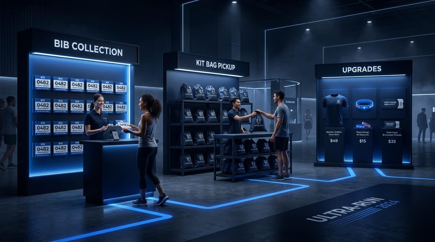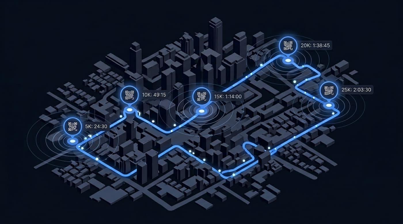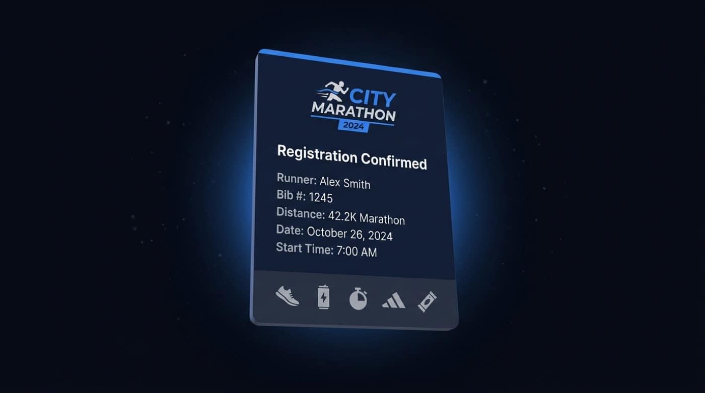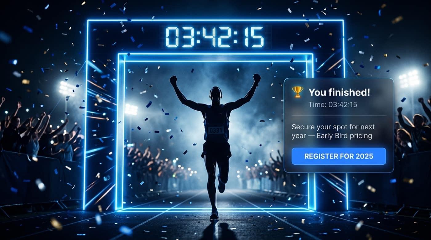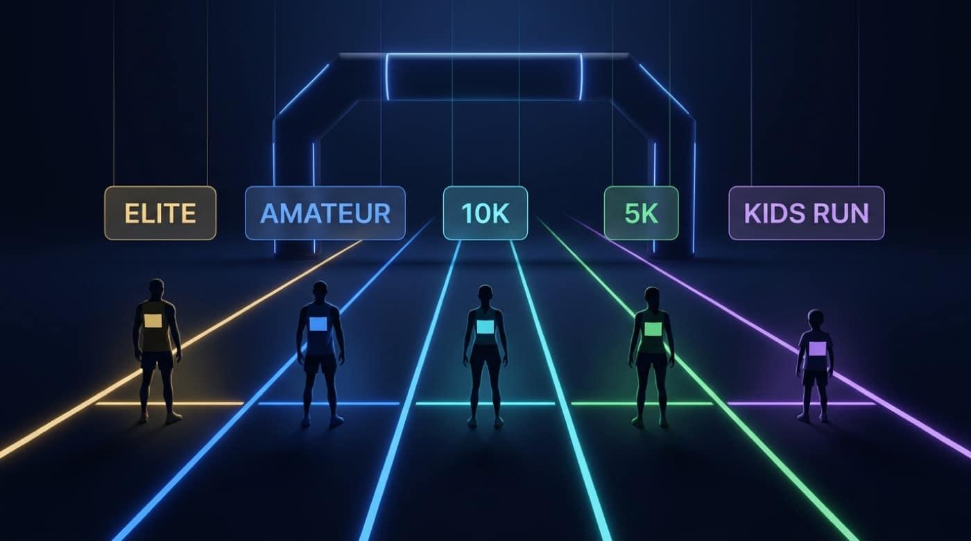Built for mass starts, 5K/10K city races, trail events, and multi-date series — sponsors visible in the purchase path and remarketing that does not depend on a generic marketplace.