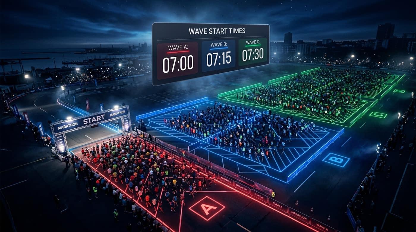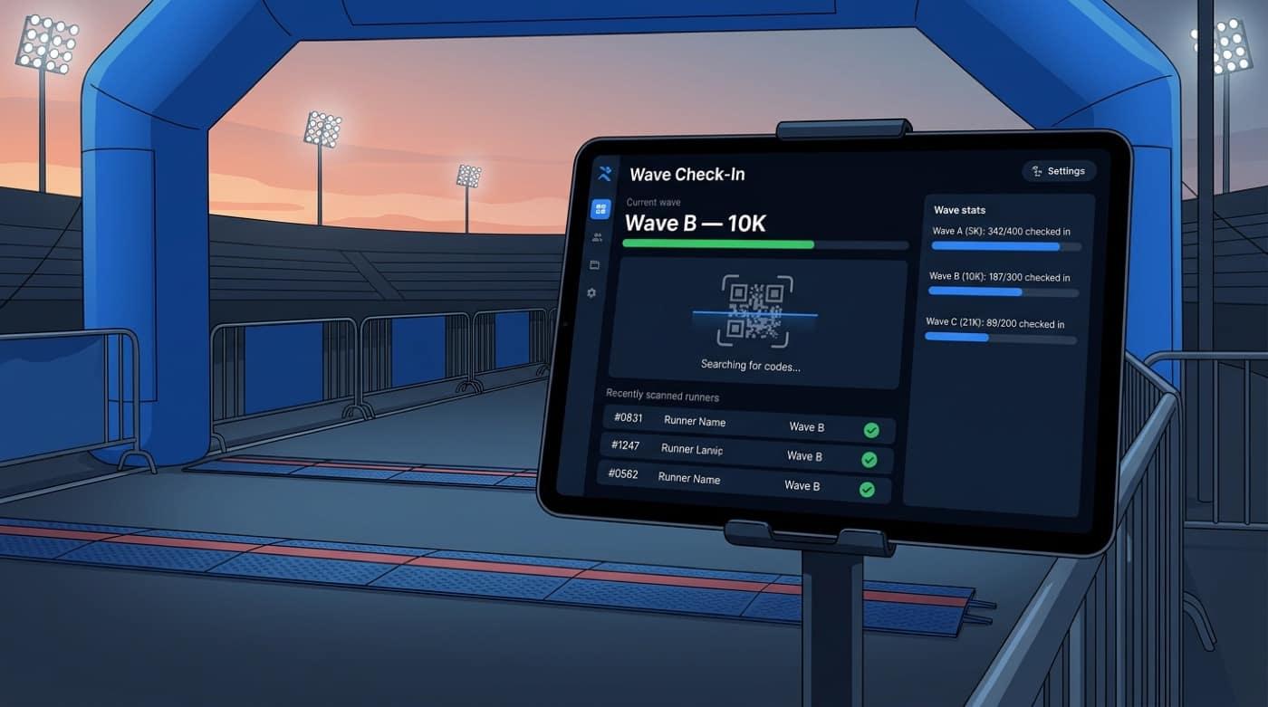 QR by wave, fast validation, and traceable starts. Less chaos at the line.