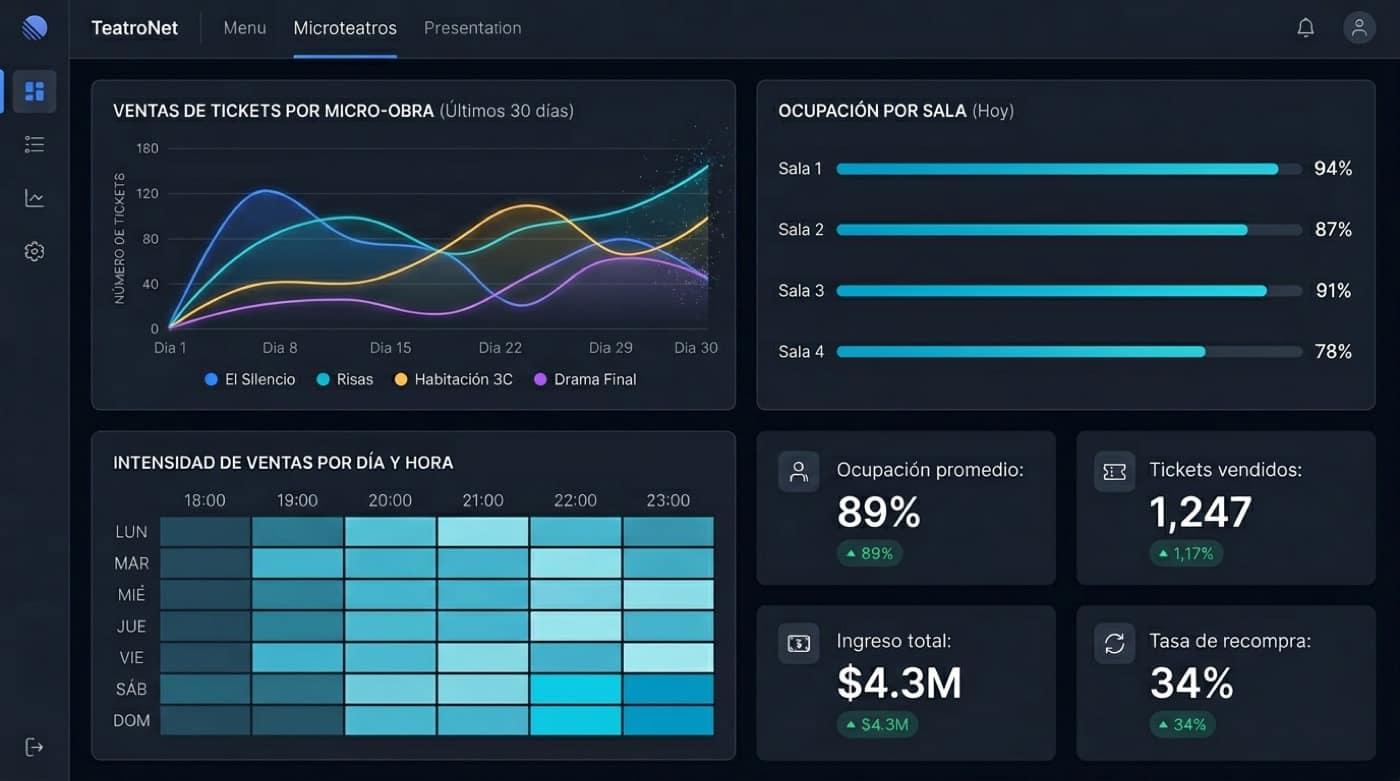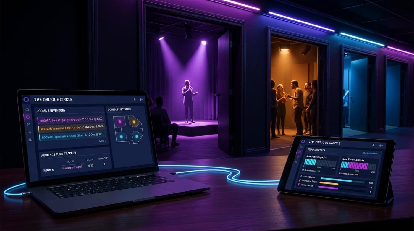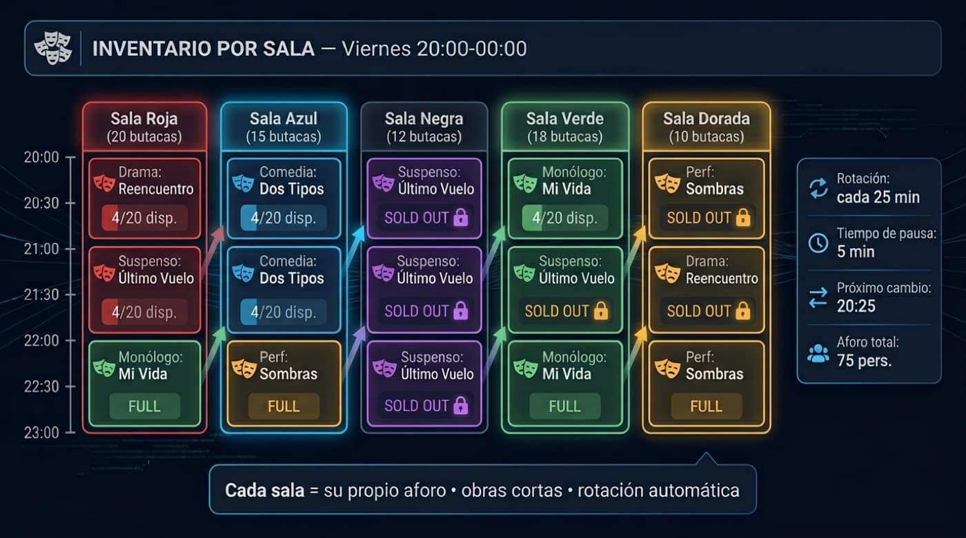Built for dense rotations, small per-room capacities, and nights where every minute between shows shapes the experience—like leaders in the format such as Microteatro.