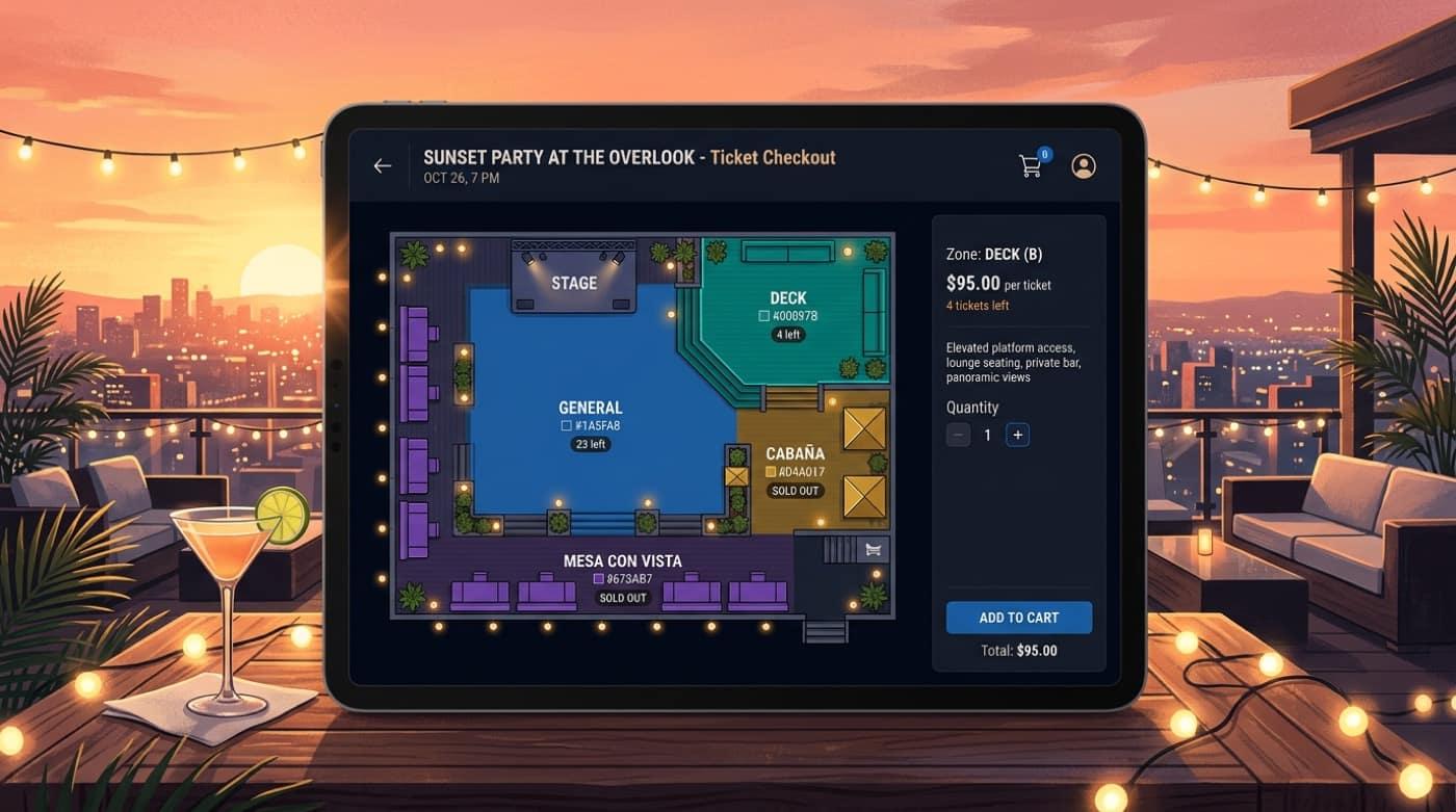 GA, deck, cabana, or waterfront table with independent caps and clear checkout messaging.