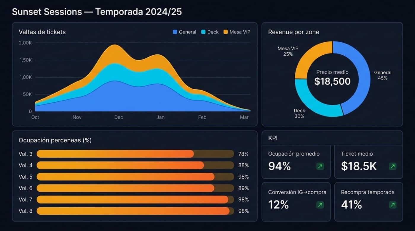 Staged releases, tables and decks with real inventory, premium drink add-ons, and QR that holds at peak. Social traffic lands on your domain and your data carries into the next season.