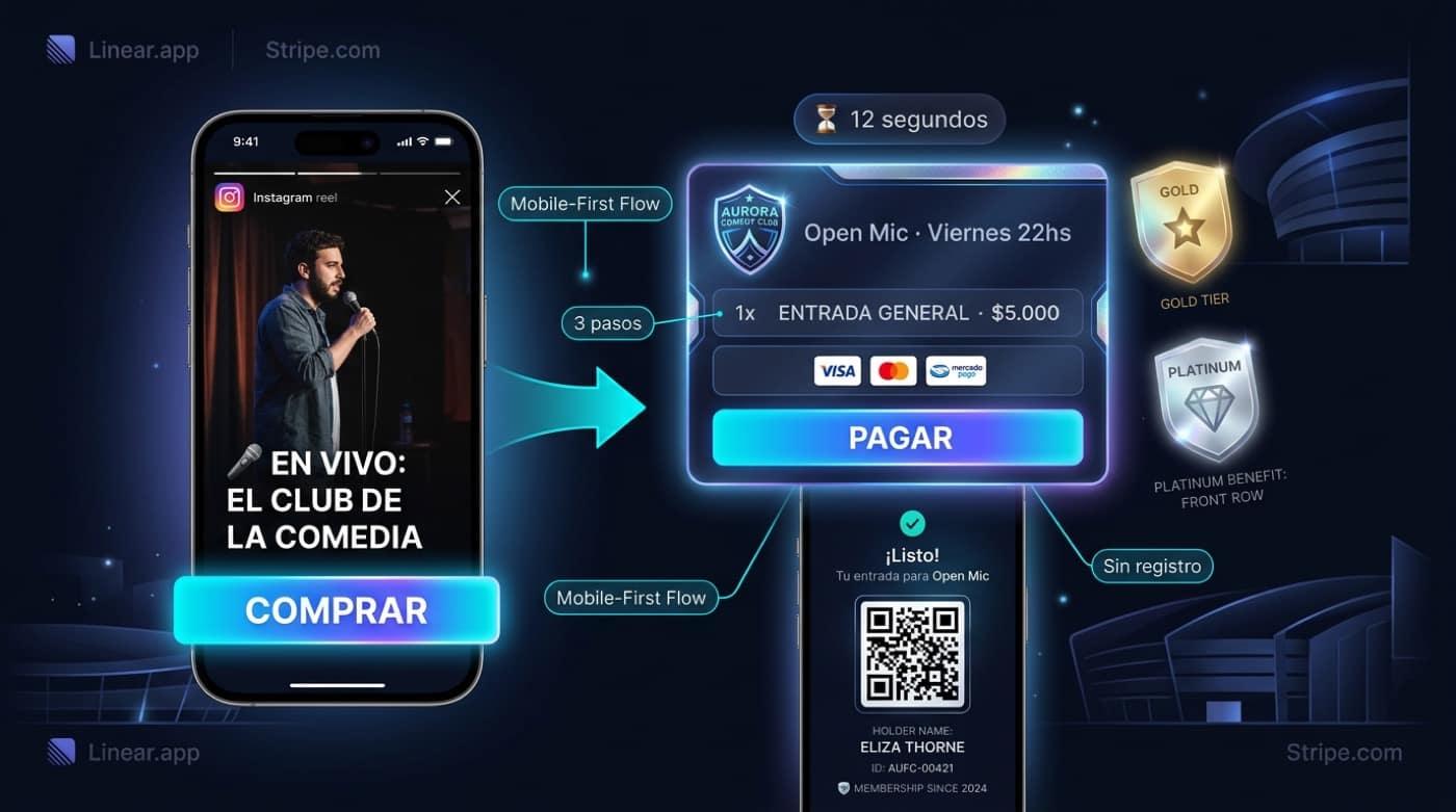 Flujo corto y mobile-first que convierte el clic del reel en butaca pagada en segundos.